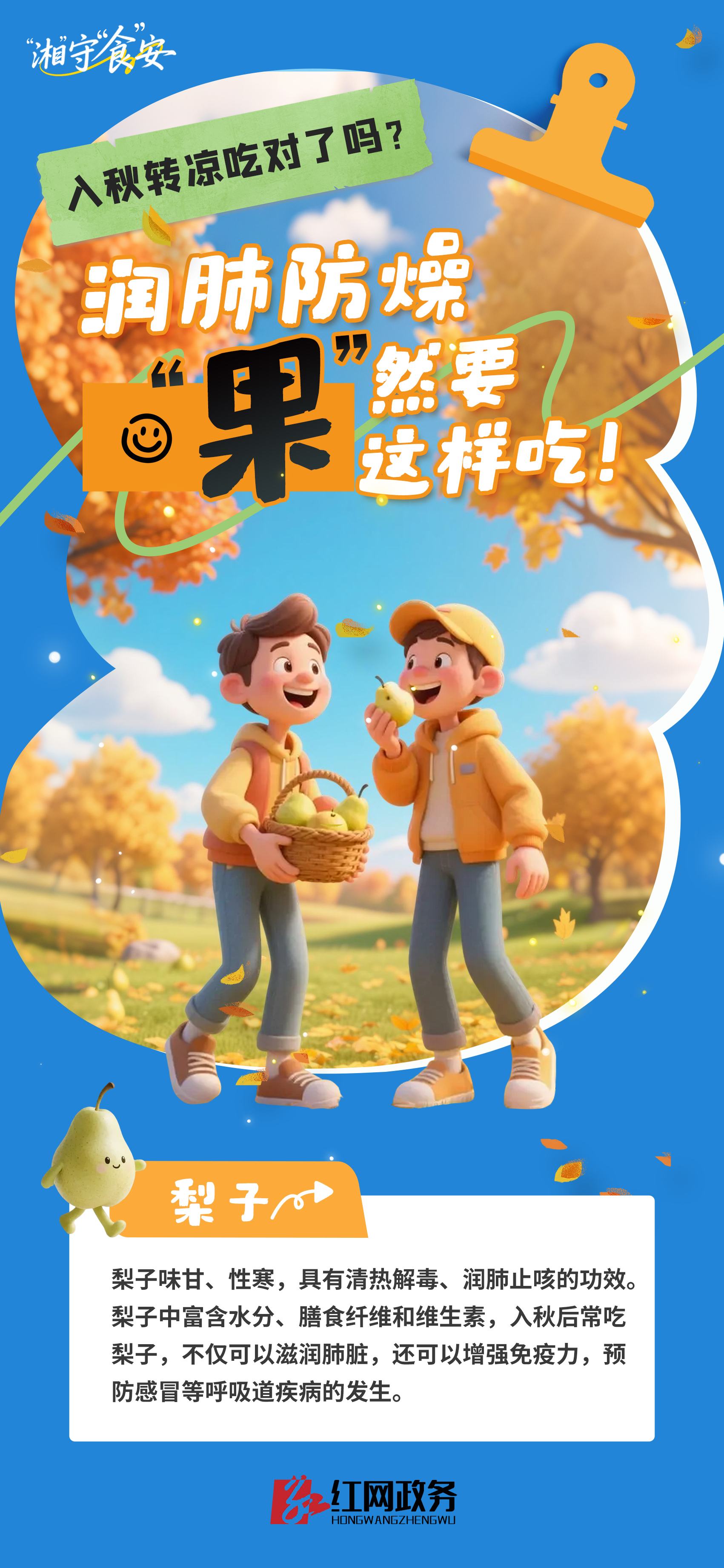 編者按:三湘四水,物阜民豐。湖南,這片孕育了“魚米之鄉(xiāng)”美譽(yù)的熱土,不僅有著令人垂涎的剁椒魚頭、臭豆腐、糖油粑粑等舌尖美味,更有著千家萬戶對“吃得放心、吃得健康”的殷切期盼。由湖南省市場監(jiān)督管理局與紅網(wǎng)時(shí)刻新聞共同打造的食品安全科普專欄——“湘”守食安,讓食品安全知識“飛入尋常百姓家”,讓每一份味道,都承載著安心與幸福! 秋意漸濃,天氣干燥,你的身體是否也開始“鬧情緒”? 喉嚨干、皮膚糙、易咳嗽……別慌! “秋吃果,潤肺燥”,小編為你整理了一份秋季食養(yǎng)清單, 吃對食物,輕松應(yīng)對“秋燥”模式!