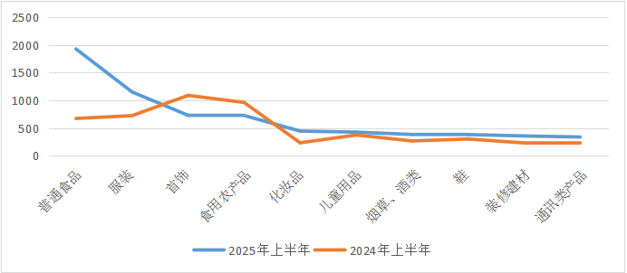 上半年共受理商品類投訴13663件(如圖二所示)。食品類、日用商品類、家用電子電器類、服裝鞋帽類、首飾及文體用品類投訴量居前五位。與去年同期相比(如表二所示),服裝鞋帽類,日用商品類,家用電子電器類投訴量比重上升,首飾及文體用品類,農用生產資料類,交通工具類投訴量比重下降。