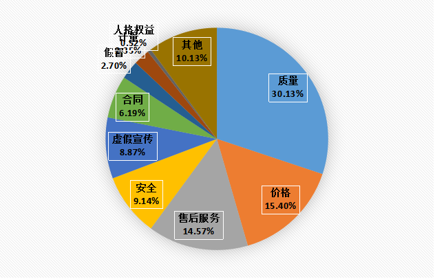 根據投訴性質(如圖一所示),質量問題占30.13%,價格問題占15.4%,售后服務問題占14.57%,安全問題占9.14%,虛假宣傳問題占8.87%,合同問題占6.19%,假冒問題占2.7%,計量問題占2.35%,人格權益問題占0.52%,其他問題占10.13%。與去年同期相比(如表一所示),質量、虛假宣傳問題投訴比重上升,安全、售后服務、合同問題投訴比重下降。
