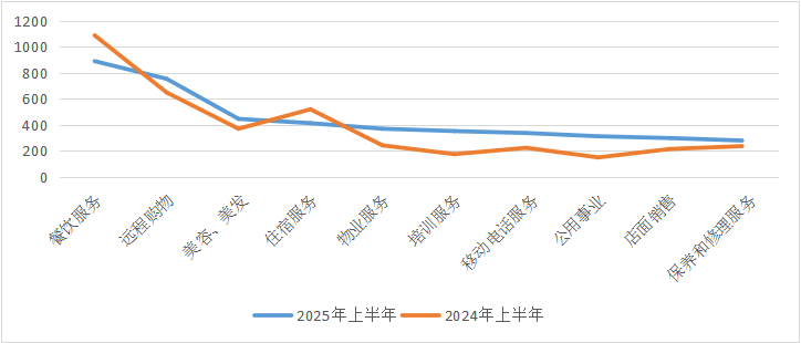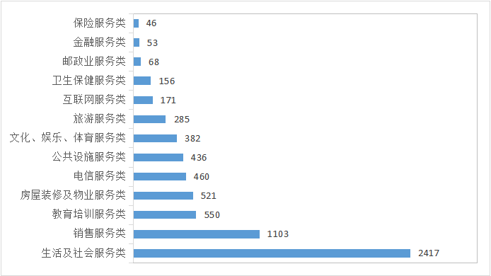 具體服務投訴中投訴量居前五位的分別為(如圖五所示)餐飲服務、遠程購物、美容、美發、住宿服務、物業服務。與去年同期相比(如表五所示),公用事業、培訓服務,物業服務、移動電話服務和店面銷售投訴上升,住宿服務、餐飲服務投訴下降。